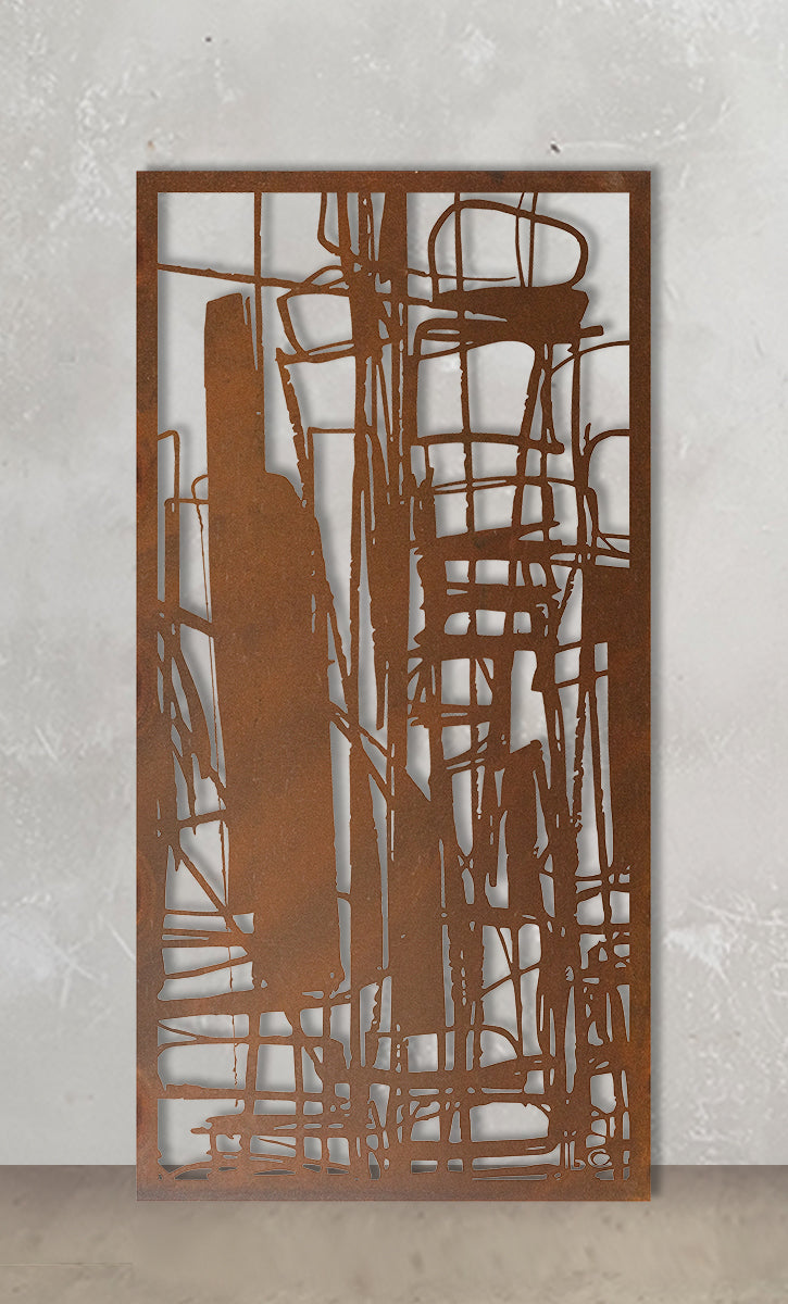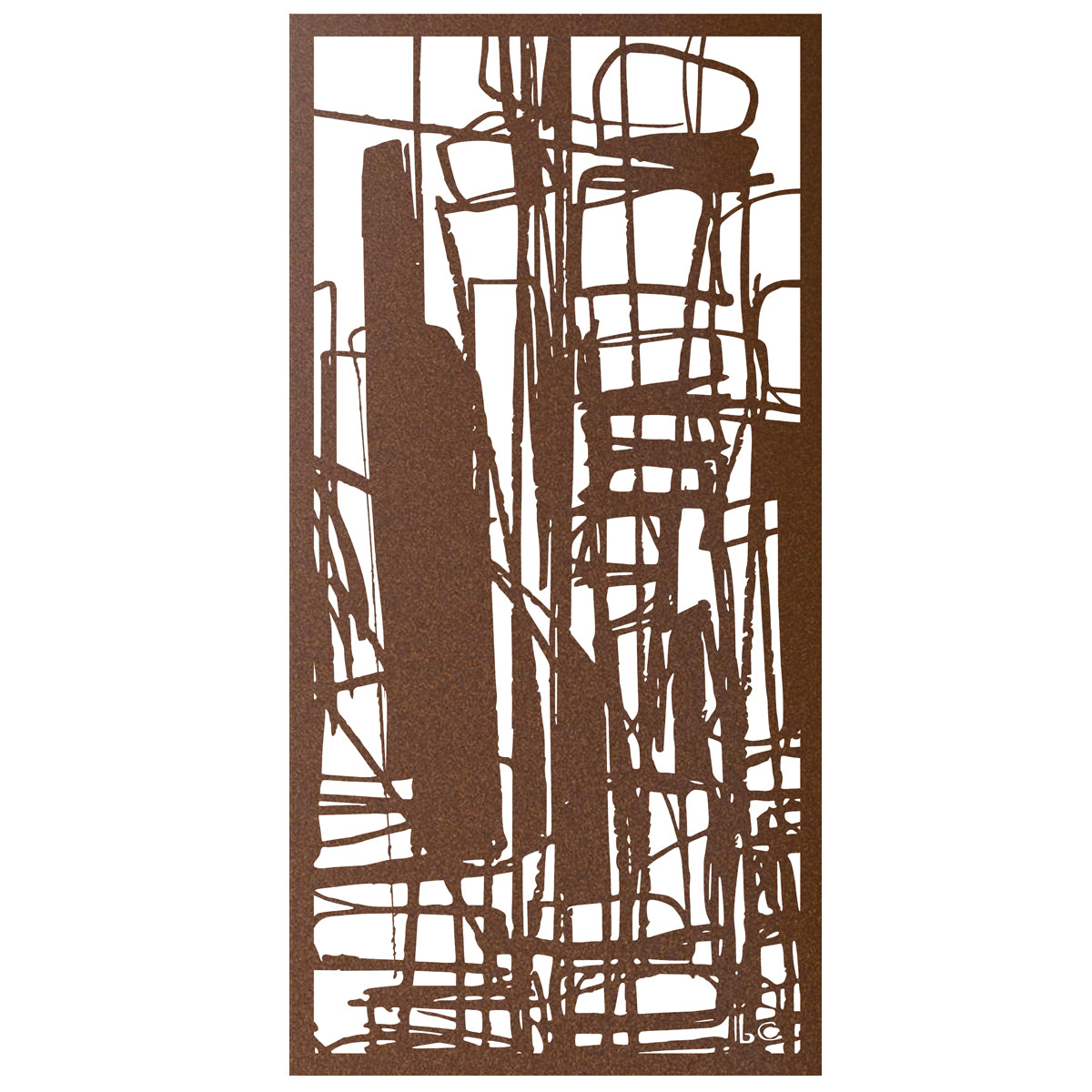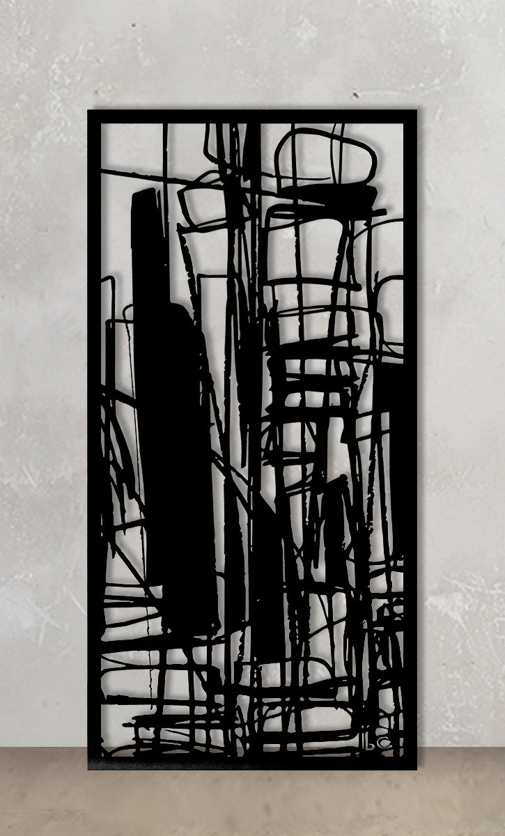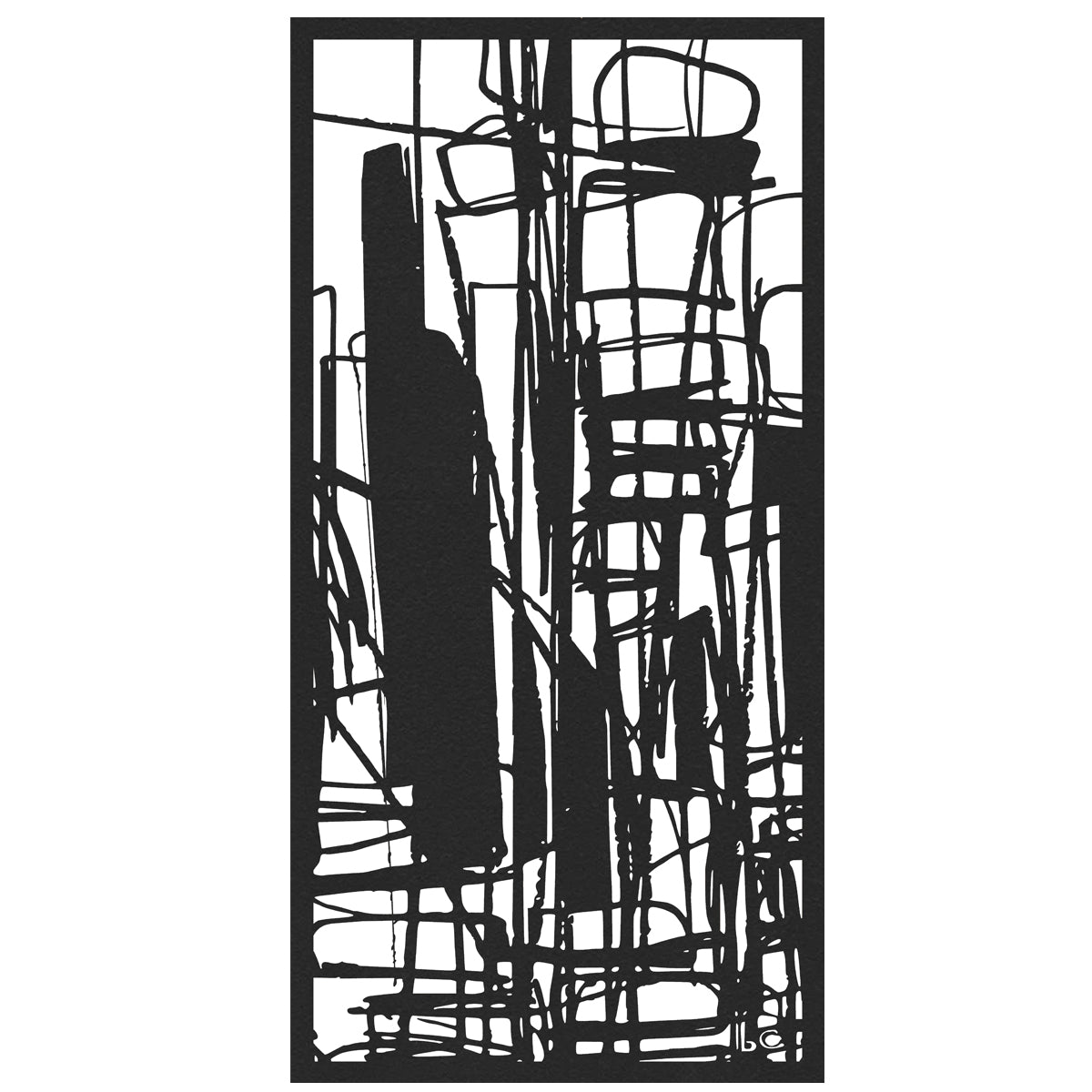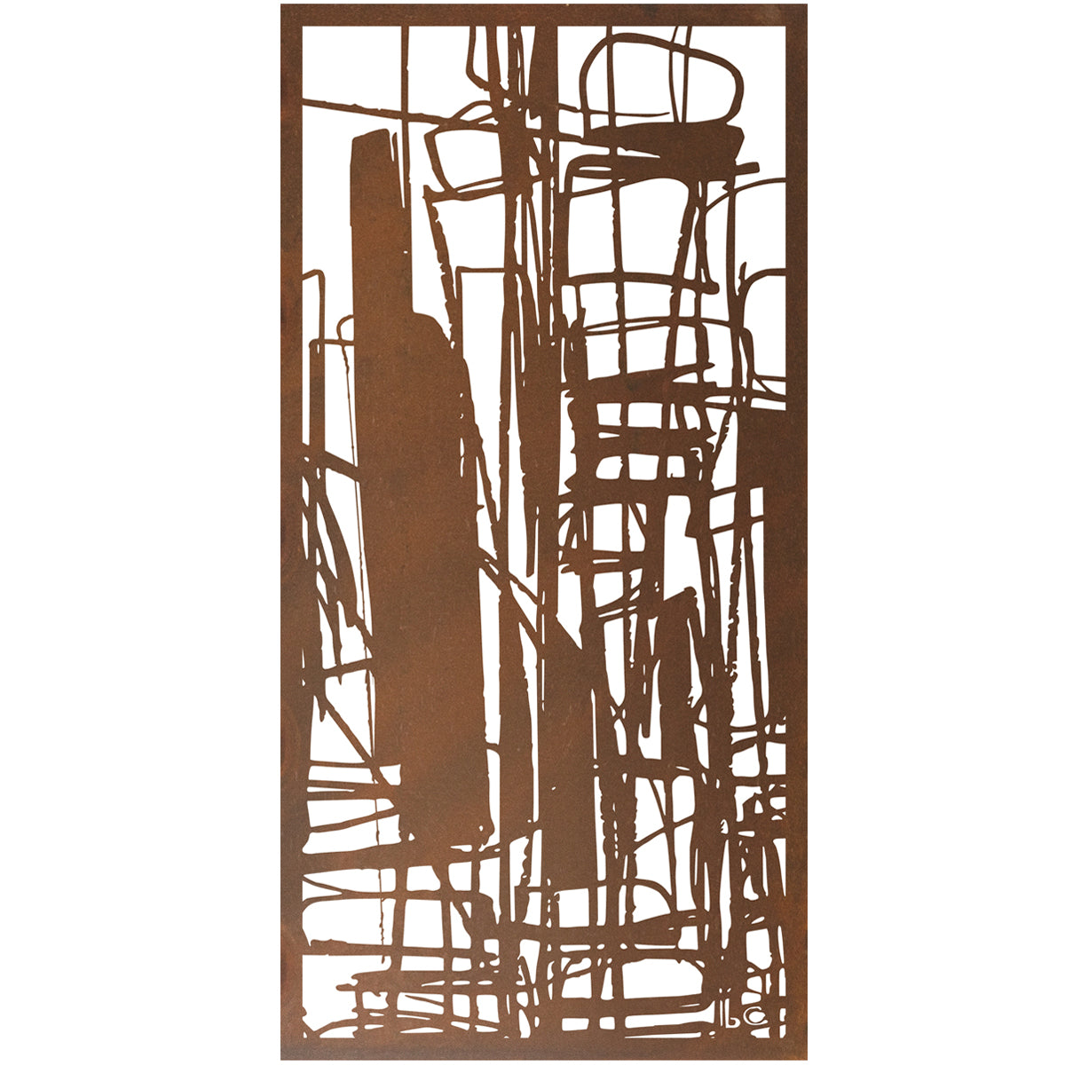 This abstract piece depicts a sprawling metropolis with it's laser cut angular shapes and contours. The complex city screen fits perfectly as an artsy feature piece in indoor and outdoor areas, or can be used as a divider between areas.