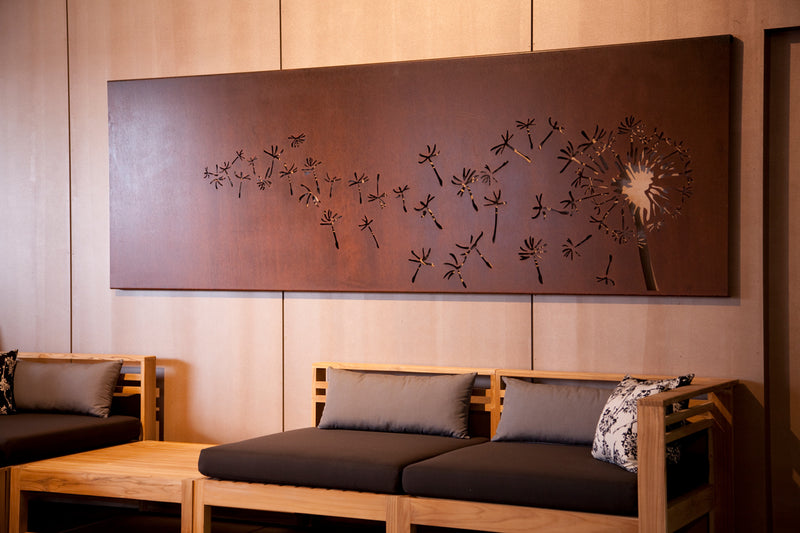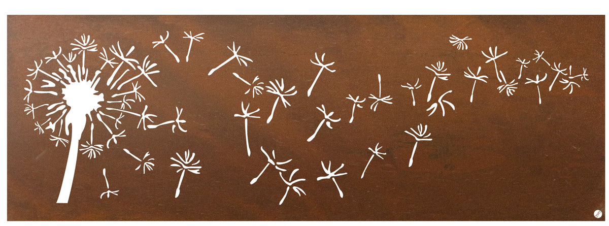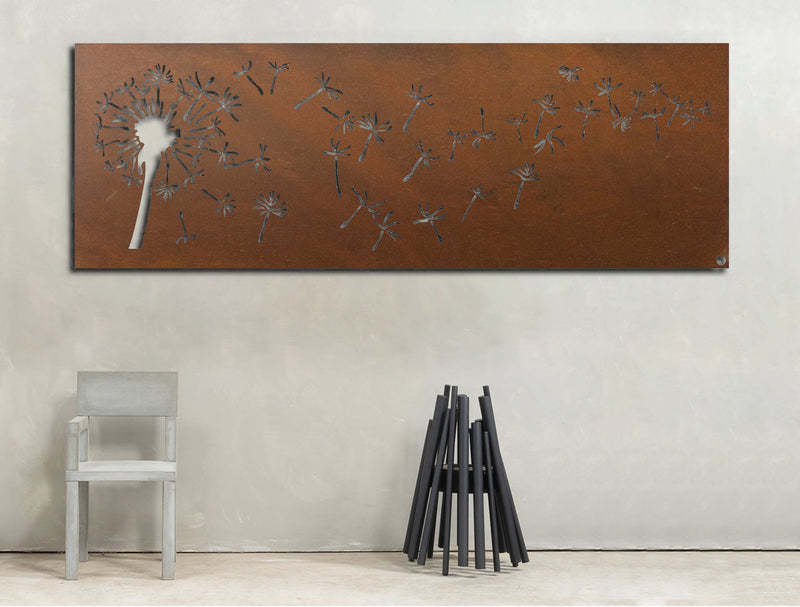 Add a touch of whimsy to your indoor or outdoor space with our Dandelion Landscape Metal Wall Art. This stunning design features dandelion seeds floating in the breeze and is shown in a naturally rusted 1.6mm mild steel finish, although other finishes and options are available.