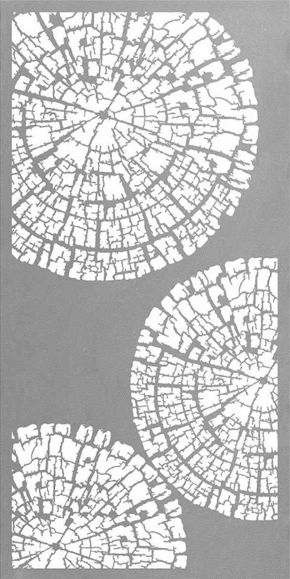 This piece represents the growth rings of an old large tree. It reminds us of the power and age of nature and is perfect for a wall or fence mount. This piece is made of aluminium and is ready to be powder coated.