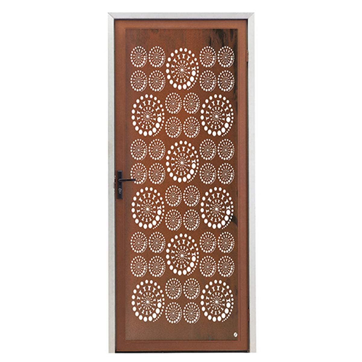 Our "Koru" security screen door features one of the most meaningful and beautiful symbols in Maori culture. We tried to represent that in our Koru series of garden art and decor, utilising the natural geometry of a silver fern frond to inspire the design. This is a custom screen door which will be made to size.