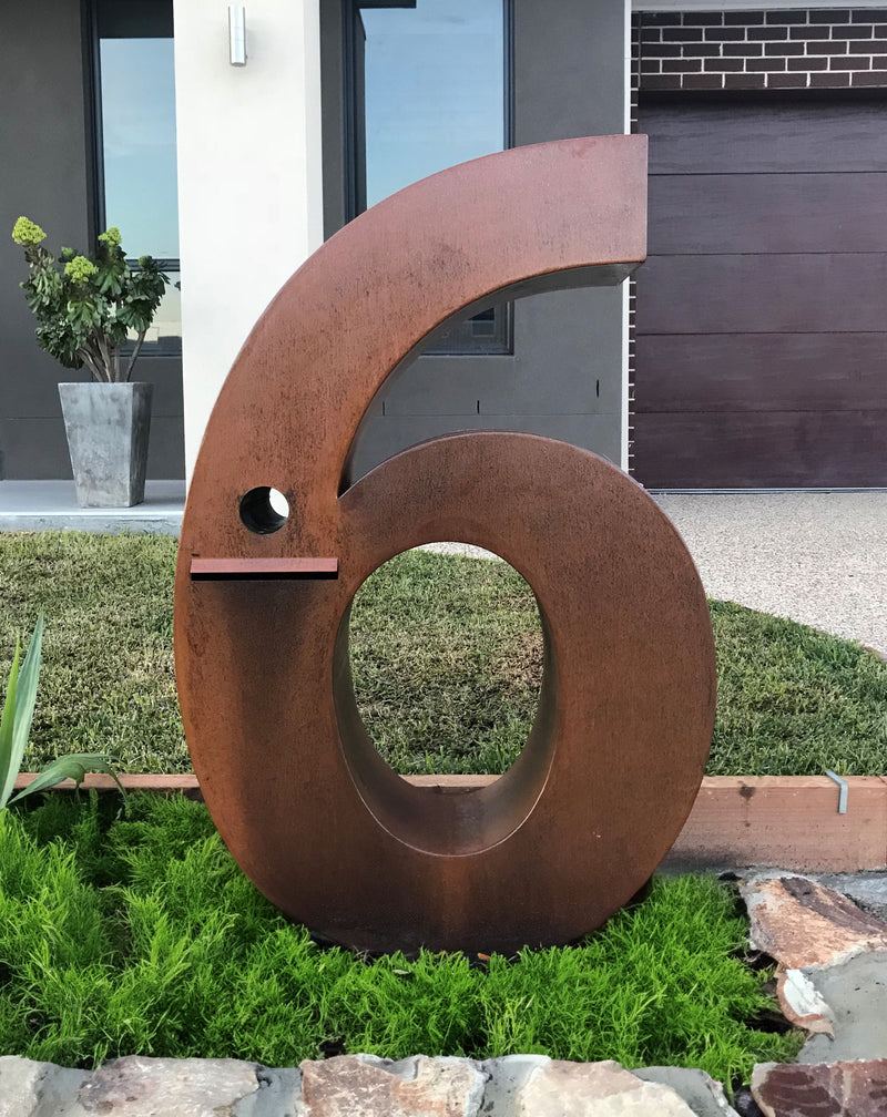 Make a bold statement with Entanglements' large 3D numbers, perfect for effective street signage. Each character is constructed from mild steel with a natural rust finish, providing a unique and eye-catching look. The simple base plate allows for easy installation, and installation holes are available on request free of charge.