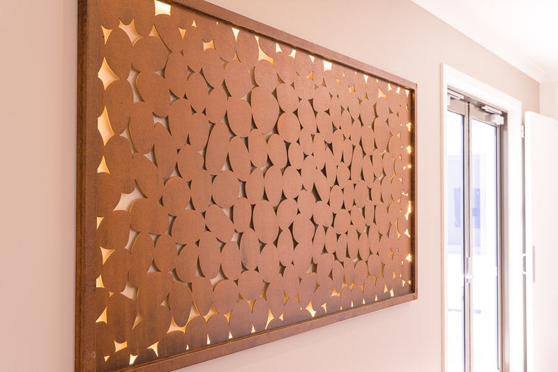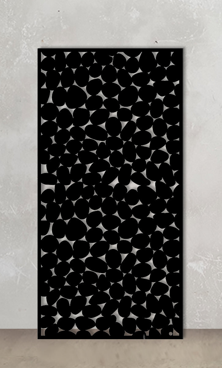 This simple design is elegant and fun. It features an array of pebbles filling the screen. The different shapes and sizes of pebbles keeps the piece engaging and exciting and we love how it looks mounted against a wall.