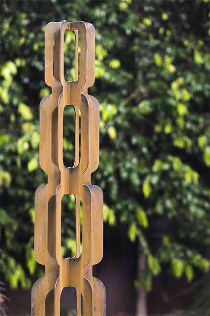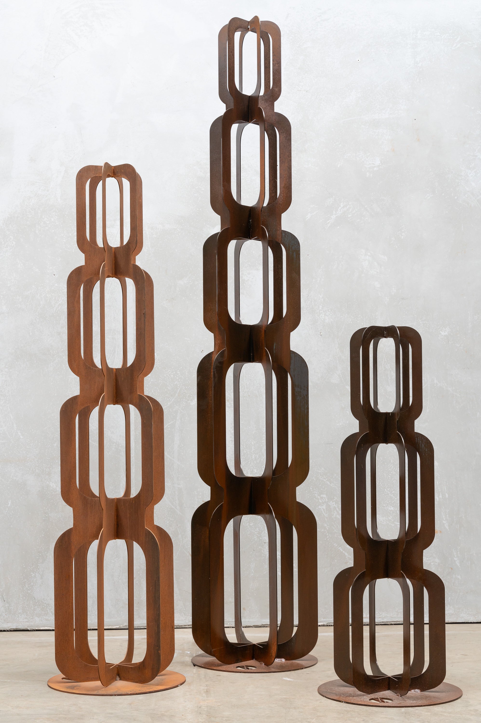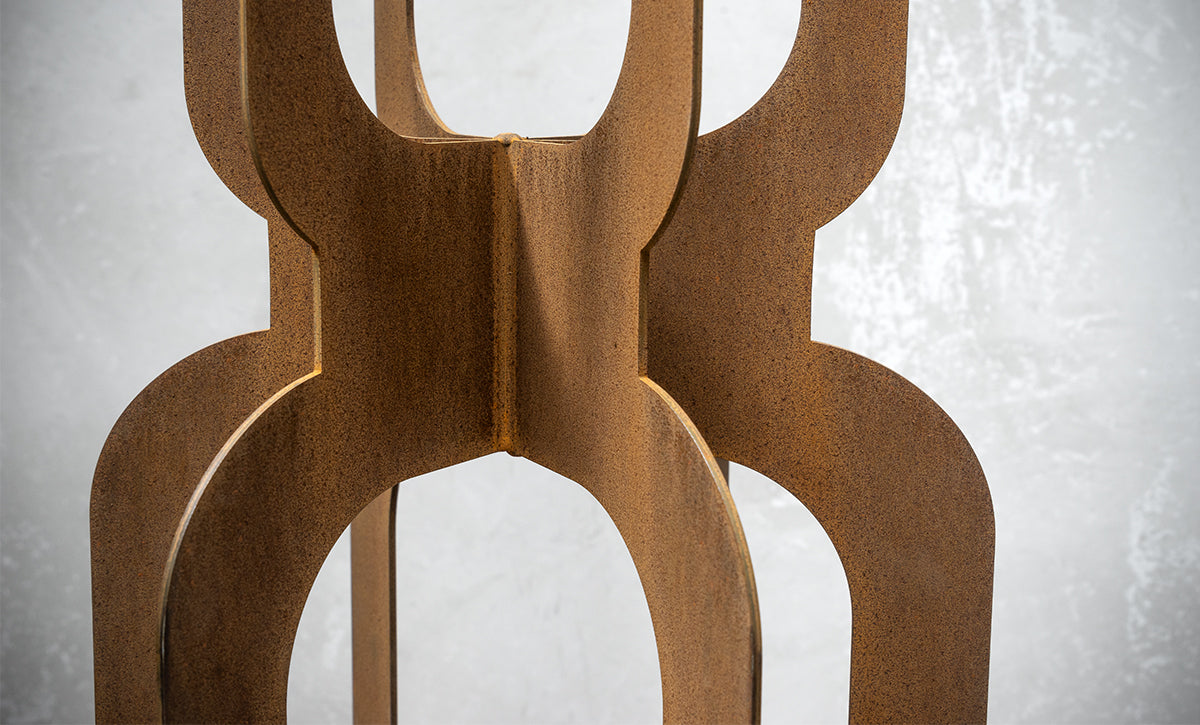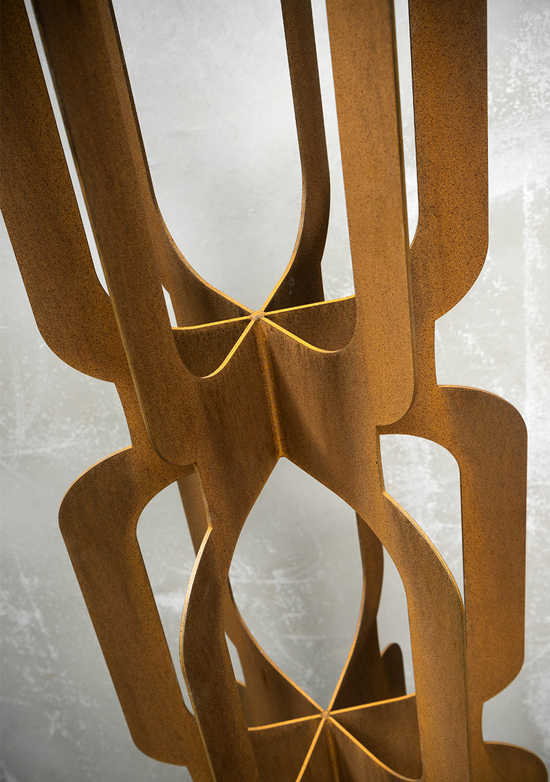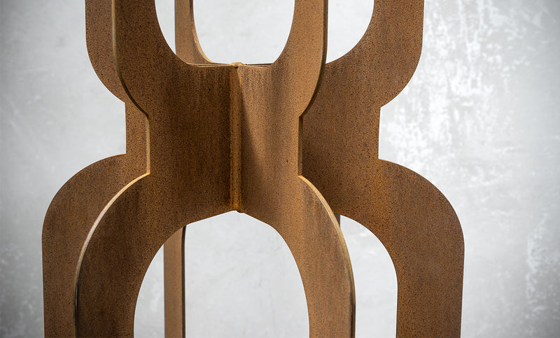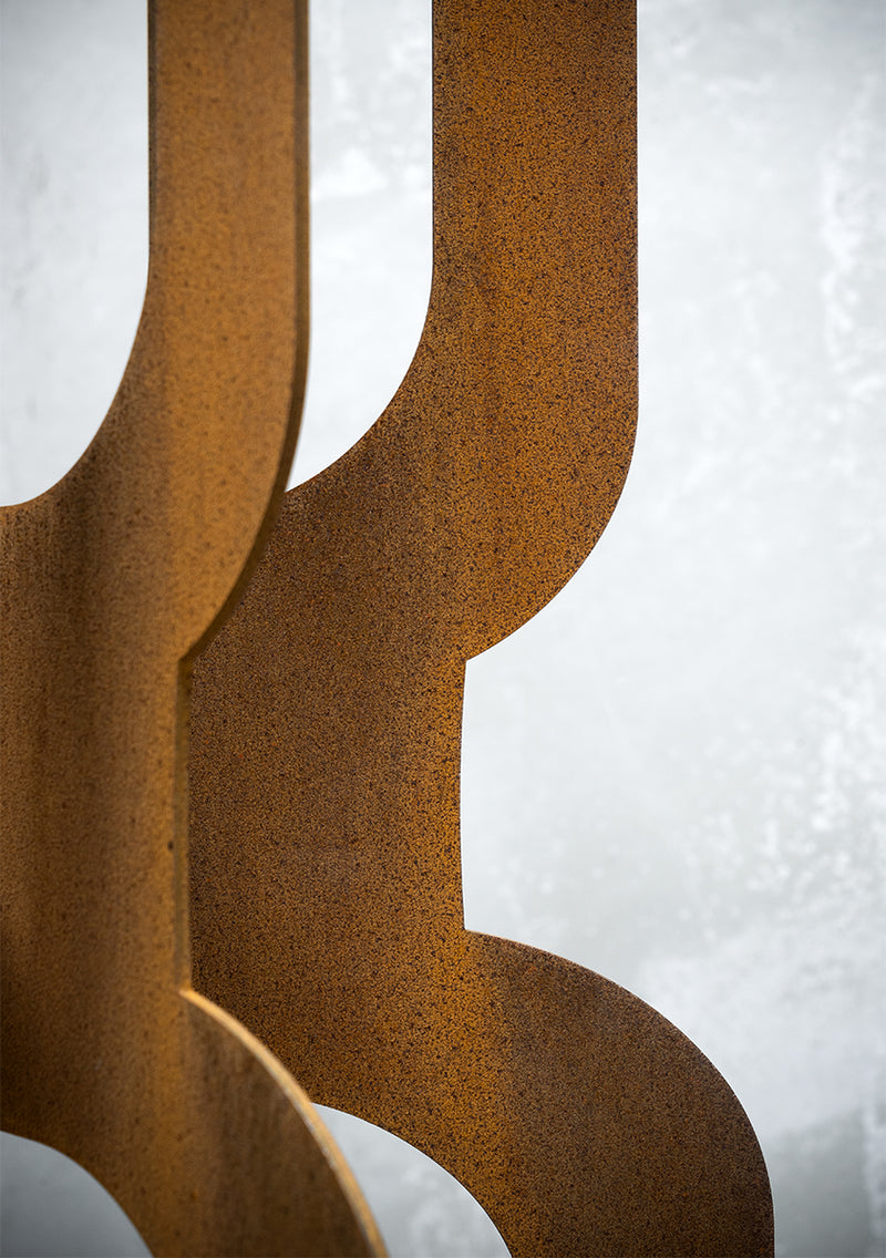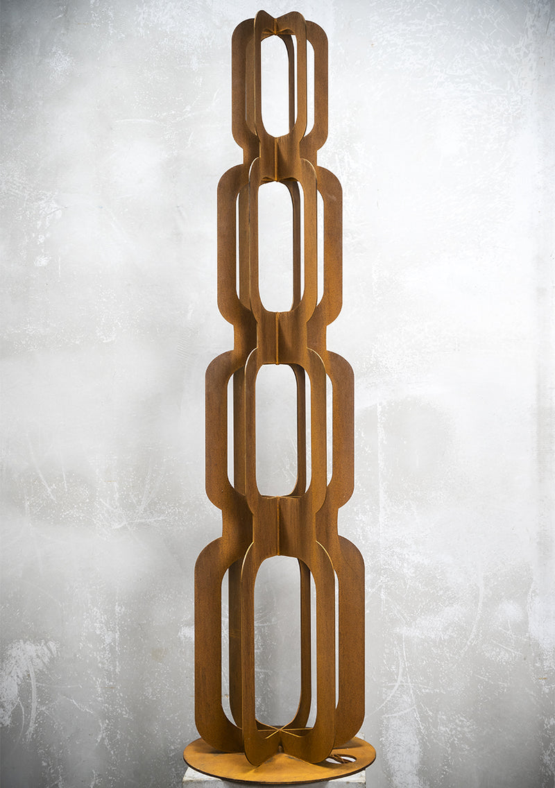 Inspired by the mid-century Mad Men era, the Totem Groove is a bold and stylish tower sculpture crafted from 3mm rusted mild steel. Its slender, interlocking form creates a striking 3D effect, making it a captivating feature from every angle.