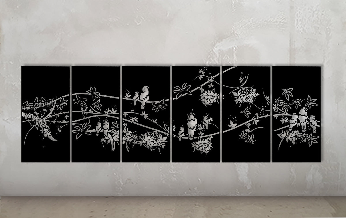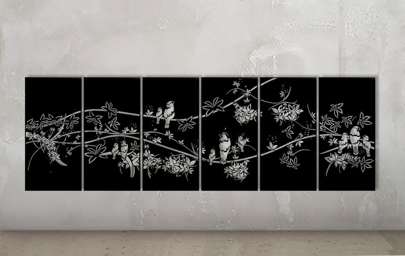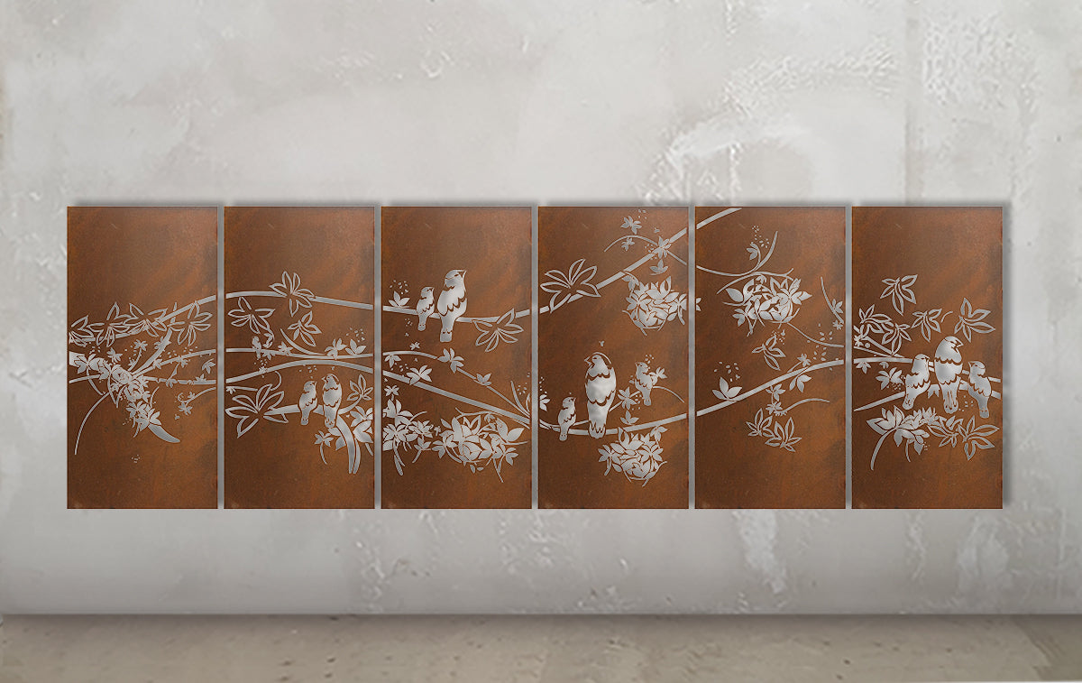 Our ‘Tropic’ series of metal art aims to emulate the appearance and feel of a warm, vibrant and tropical environment. This sequence is comprised of six individual panels, creating a flowing and coherent image of a tropical branch, brimming and buzzing with life, as various tropical birds nest upon it. The combined image across the six panels is a sight to see, and each panel can be mounted to a wall or fence, either indoors or outdoors.