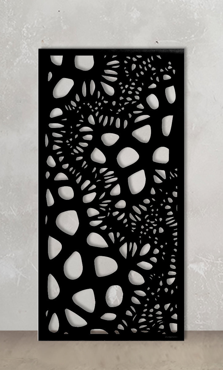 This screen is one of our busier designs, containing an array of shapes sprawling across the entire panel. The resulting design is mesmerising, and looks great when mounted to an indoor or outdoor wall.